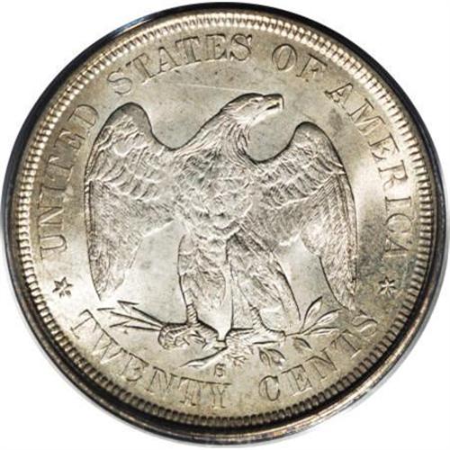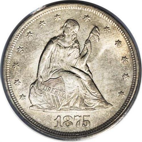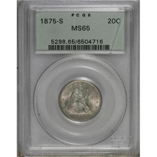 <B>1875-S 20C MS65 PCGS.</B></I> FS-302. The mintmark is repunched, and a date digit is misplaced in the dentils. A lustrous Gem with lovely olive-green toning that lightens in the centers. Well preserved save for a hidden mark beneath the knees. A scarce silver type at the MS65 level. Struck from clashed dies, and housed in a green label holder.<BR><BR><B>Coin Engraver:</B> William Barber<BR><BR><b>Shipping:</b> Coins & Currency (<a target="_blank" href="http://www.heritageauctions.com/common/shipping.php">view shipping information</a>)