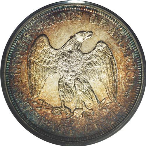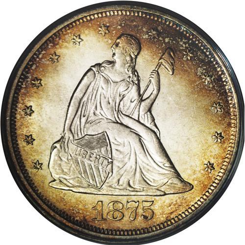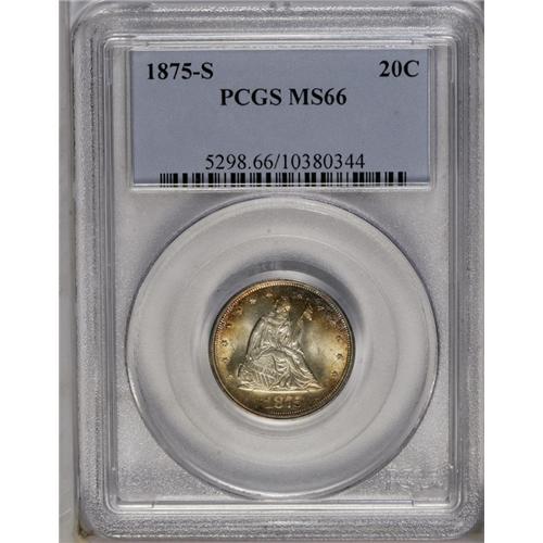 <B>1875-S<20C> MS66 PCGS.</B></I> A lovely Premium Gem example of this popular type coin, with lustrous silver centers and pretty brownish-gold peripheries, deepening to magenta and electric blue on the reverse. The strike is bold, save for localized weakness on the top of the eagle's left (facing) wing, and slight weakness on Liberty's head and the two stars nearby. Although this issue constitutes the vast majority of the available pieces from the entire twenty cent series, few are found at this rarefied grade level, and they are virtually unobtainable any finer. Both services together have certified less than 100 examples in the MS66 grade, with a total of eight coins finer. If you prefer your coins with lovely original toning, this piece is for you. Population: 51 in 66, 4 finer (6/06).