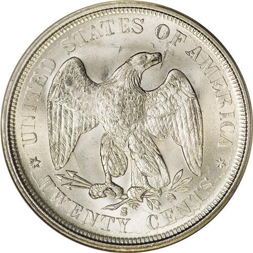 <B>1875-S 20C MS66 PCGS.</B></I> Breen-3875, Doubled "$" Mintmark; FS-302. The S mintmark is repunched, and the top of a digit, likely a 5, is visible in the denticles below the 7 in the date. Swirling luster radiates from the untoned surfaces of this Premium Gem. A near continuous die crack encircles the reverse periphery, whereas discontinuous light cracks occur at portions of the obverse margins. The design elements are well impressed throughout. Population: 57 in 66, 4 finer (4/07).<BR><BR><b>Shipping:</b> Coins & Currency (<a target="_blank" href="http://www.heritageauctions.com/common/shipping.php">view shipping information</a>)