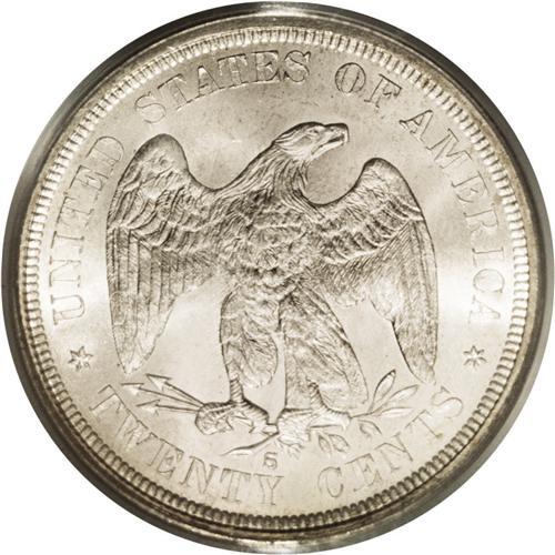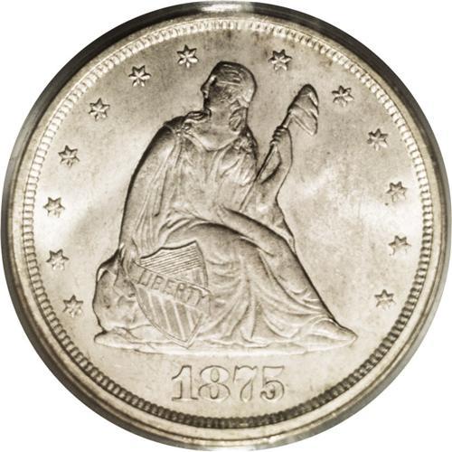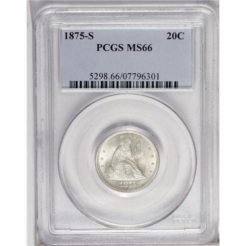 <B>1875-S<20C> MS66 PCGS.</B></I> MPD-001. This minor misplaced date variety is more noteworthy for its sharply repunched mintmark. A lustrous Premium Gem with light silver-gray toning and an exacting strike. Remarkably free from marks, and an outstanding contribution to a high quality Seated Liberty type set. Population: 53 in 66, 4 finer (9/06).
