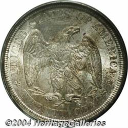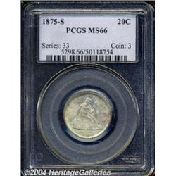 <B>1875-S<20C> MS66 PCGS.</B></I> Well struck with bright satiny luster and lovely variegated pastel colors on the obverse, and speckled patina on the reverse. Other than a small contact mark on Liberty's head, which extends from just below her ear onto her cheek, the carefully preserved surfaces seem mark-free. <BR><BR><B>Important notice:</B> Heritage usually auctions material at the rate of 200-250 lots per hour. On some occasions eBay Live bid software or the Internet may not be able to keep up with the pace of the auction. We recommend placing a realistic absentee bid now as insurance to avoid disappointment. Occasionally the auctioneer may eliminate or reject an eBay Live bid, and the auctioneer may also reopen a lot after the close of the eBay live bidding (usually because we missed an audience bid), and may reject your bid even if it shows you as the winning bidder. By bidding via eBay Live, you agree that Heritage may award the lot to another bidder at its sole discretion under the circumstances described above or any other reasonable circumstances. Since eBay bids are not shown to us until we open the lot on the floor, we treat those bids just like floor bids. In most cases the floor responds before the eBay bid is presented to us, due to Internet lag time, so for consistency we have made it a policy that floor bids are always considered first over tie eBay live bids. Also please note that all Heritage lots purchased through eBay Live carry a 20% Buyer's Premium. Please make sure you read the Terms and Conditions before you bid. </span></font></tr></table></td></tr></table>