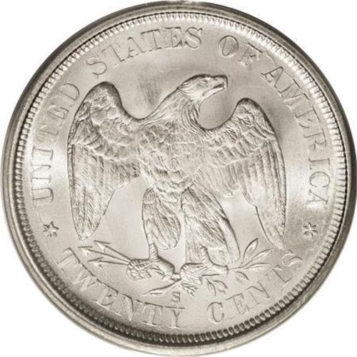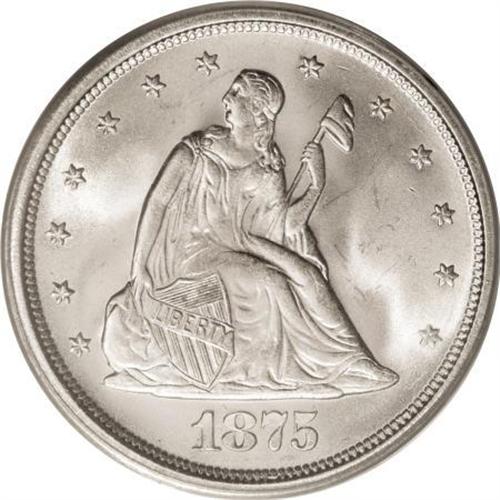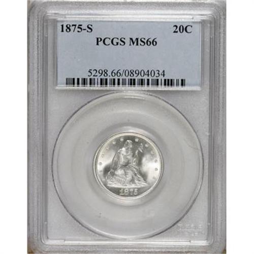 <B>1875-S 20C MS66 PCGS.</B></I> FS-302. The mintmark is nicely repunched, and the top of an apparent 5 is present in the denticles beneath the 7 in the date. Just a hint or two of barely discernible light orange color is noted on this highly lustrous and undisturbed Premium Gem. Crisply struck, beautiful, and worthy of a high quality silver type set. Population: 57 in 66, 4 finer (6/07).<BR><BR><b>Shipping:</b> Coins & Currency (<a target="_blank" href="http://www.heritageauctions.com/common/shipping.php">view shipping information</a>)