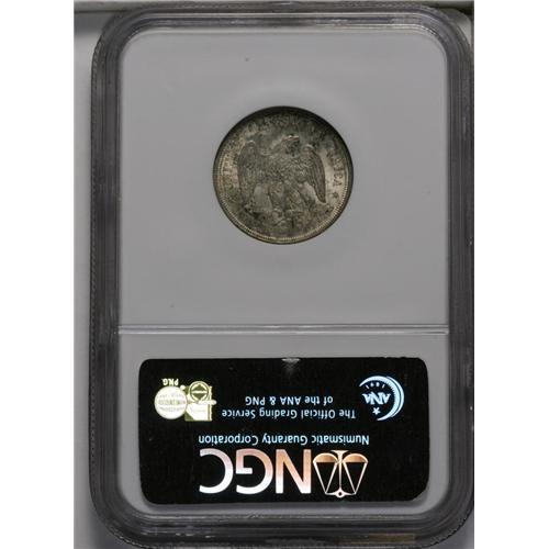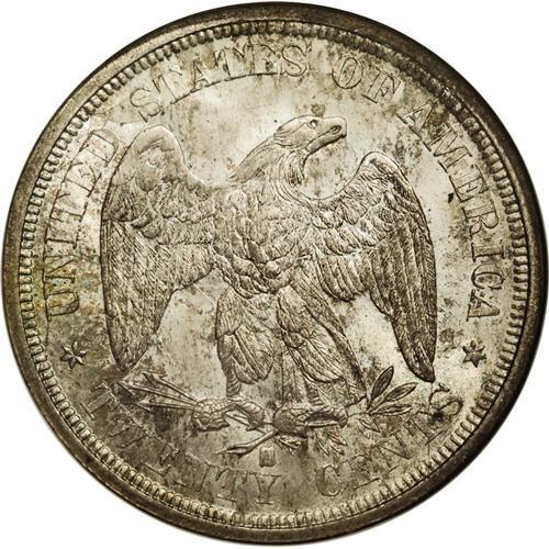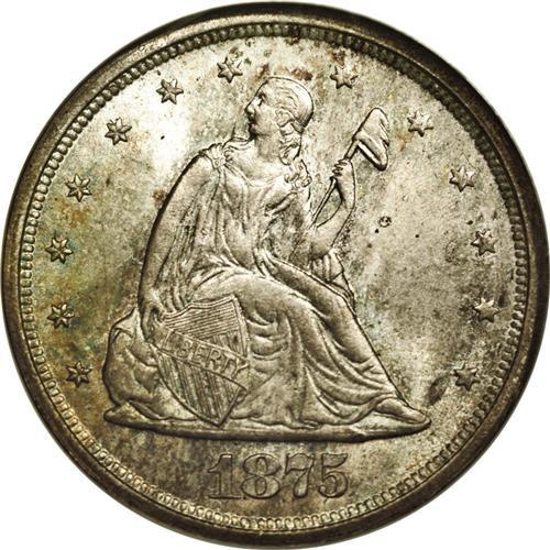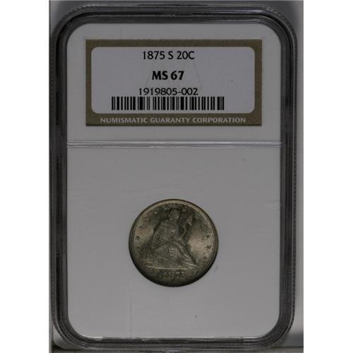 <B>1875-S<20C> MS67 NGC.</B></I> While it seemed like such a good idea, the twenty-cent piece proposed by Nevada Senator John Percival Jones was bound to fail. The purpose of this denomination was to ease transactions of low-priced items, especially those selling for five or ten cents, especially on the West coast. The half dime was no longer being coined, and minor coinage was not being produced in San Francisco at the time, nor would it be until the first cents of 1908. A consumer who desired to buy an item priced at five cents would need to use a dime, if one was available, and no change would be given, for none was available. Senator Jones felt that such an item could be bought using a quarter, and one of the new 20-cent pieces could then be given out in change. The problem was not so much the concept, but the size and design, which were so similar to the existing quarter dollar that the two coins were easily confused. These coins were produced for circulation only in 1875 and 1876, and the series continued for two more years only in proof format.<BR> This example is one of the finest survivors that we have seen. In fact, a review of the NGC Census (6/06) reveals that only 13 examples of the entire type have been graded MS67, with one MS67 <img border='0' src='http://www.heritagecoins.com/images/star.gif' width=10 height=10>, and one MS68 example. This is a fully original example with frosty and highly lustrous ivory surfaces that are enhanced by light iridescent toning. The peripheral design details are somewhat softly struck, as often for this denomination. This Superb Gem retains exceptional eye appeal; an outstanding example in every regard. Census: 4 in 67, 1 finer (6/06).<BR><I>From The Belle Glade Collection.</B></I> <BR><BR><B>Important