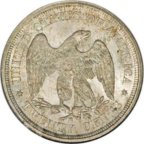 <B>1875-S 20C MS67 NGC.</B></I> MPD-002. With a mintage more than five times that of all the other business strike twenty cents issues combined, it is little wonder that the 1875-S has become the type coin of choice for this short-lived odd denomination. The Superb Gem offered here is one of the finest known representatives, since NGC and PCGS have certified just two finer examples between them (10/07). The luster is frosty with a touch of satin, and both sides show delicate golden-tan toning with hints of pink and silver-gray. The reverse margins show a measure of blue-green patina as well. Though the upper and right stars of the obverse show a degree of softness, the rest of the coin is well-defined, and its visual appeal is as amazing as its overall preservation.<BR><BR><B>Coin Engraver:</B> William Barber<BR><BR><b>Shipping:</b> Coins & Currency (<a target="_blank" href="http://www.heritageauctions.com/common/shipping.php">view shipping information</a>)