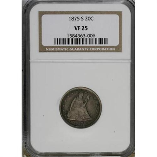 <B>1875-S 20C VF25 NGC.</B></I> NGC Census: (0/0). PCGS Population (0/0). Mintage: 1,155,000. Numismedia Wsl. Price for NGC/PCGS coin in NG : $1. (#5298)<BR><BR><B>Coin Engraver:</B> William Barber<BR><BR><b>Shipping:</b> Coins & Currency (<a target="_blank" href="http://www.heritageauctions.com/common/shipping.php">view shipping information</a>)