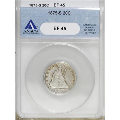 <B>1875-S 20C XF45 ANACS.</B></I> NGC Census: (58/1583). PCGS Population (93/1805). Mintage: 1,155,000. Numismedia Wsl. Price for NGC/PCGS coin in XF45: $224. (#5298)<BR><BR><B>Coin Engraver:</B> William Barber<BR><BR><b>Shipping:</b> Coins & Currency (<a target="_blank" href="http://www.heritageauctions.com/common/shipping.php">view shipping information</a>)
