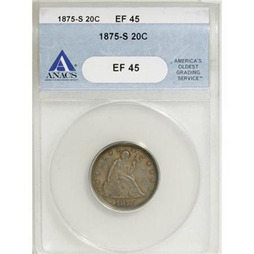<B>1875-S 20C XF45 ANACS.</B></I> . NGC Census: (58/1589). PCGS Population (93/1810). Mintage: 1,155,000. Numismedia Wsl. Price for NGC/PCGS coin in XF45: $224. (#5298)<BR><BR><B>Coin Engraver:</B> William Barber<BR><BR><b>Shipping:</b> Coins & Currency (<a target="_blank" href="http://www.heritageauctions.com/common/shipping.php">view shipping information</a>)