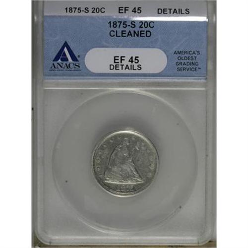 <B>1875-S 20C --Cleaned--ANACS. XF45 Details.</B></I> NGC Census: (58/1589). PCGS Population (94/1817). Mintage: 1,155,000. Numismedia Wsl. Price for NGC/PCGS coin in XF45: $235. (#5298)<BR><BR><B>Coin Engraver:</B> William Barber<BR><BR><b>Shipping:</b> Coins & Currency (<a target="_blank" href="http://www.heritageauctions.com/common/shipping.php">view shipping information</a>)