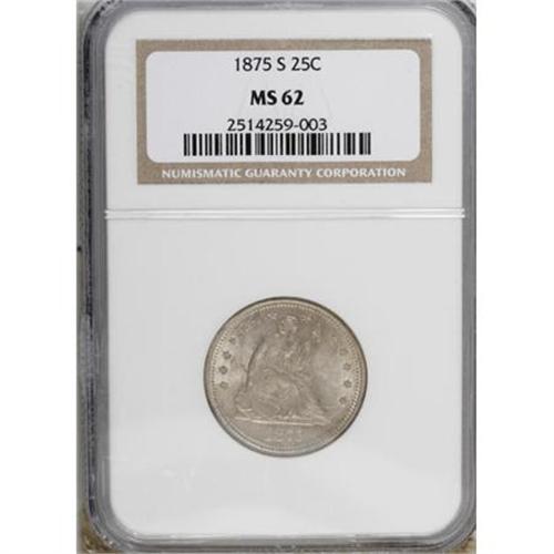 <B>1875-S 25C MS62 NGC.</B></I> NGC Census: (12/37). PCGS Population (4/40). Mintage: 680,000. Numismedia Wsl. Price for NGC/PCGS coin in MS62: $625. (#5500)<BR><BR><B>Coin Engraver:</B> Christian Gobrecht<BR><BR><b>Shipping:</b> Coins & Currency (<a target="_blank" href="http://www.heritageauctions.com/common/shipping.php">view shipping information</a>)