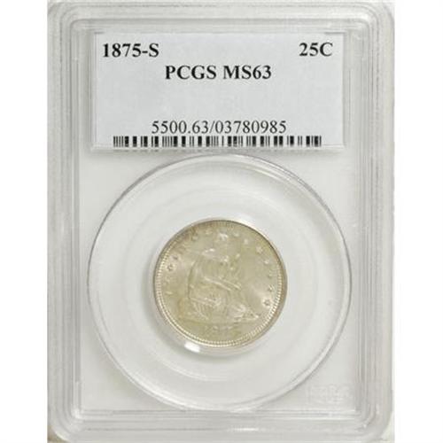 <B>1875-S 25C MS63 PCGS.</B></I> Untoned with an intense satiny sheen and a strong strike despite a network of die cracks about the reverse periphery. A faint pinscratch glances across the upper portion of the obverse. Production of twenty-cent pieces and Trade dollars at the San Francisco mint held the mintage of quarters to just 680,000 pieces. Population: 13 in 63, 25 finer (7/07).<BR><BR><B>Coin Engraver:</B> Christian Gobrecht<BR><BR><b>Shipping:</b> Coins & Currency (<a target="_blank" href="http://www.heritageauctions.com/common/shipping.php">view shipping information</a>\)