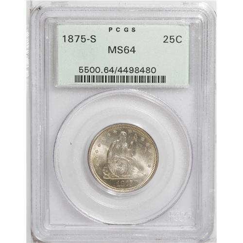 1875-S 25C MS64 PCGS. Type Two Reverse. Bright and lus