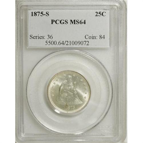 <B>1875-S 25C MS64 PCGS.</B></I> Breen-4075. Type One Reverse. A highly lustrous and lightly toned Seated Quarter with a razor-sharp strike and impressive surfaces. The peripheries have numerous spindly die cracks, as made. Although not a low mintage issue, the 1875-S is quite scarce in XF and better grades, and decidedly rare as a near-Gem. Population: 17 in 64, 8 finer (6/07).<BR><BR><b>Shipping:</b> Coins & Currency (<a target="_blank" href="http://www.heritageauctions.com/common/shipping.php">view shipping information</a>)