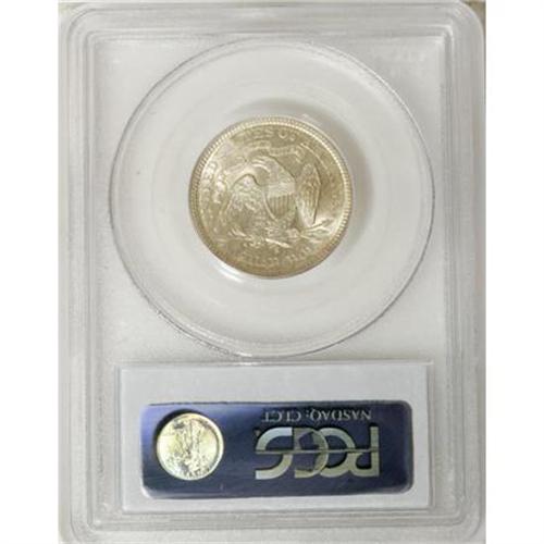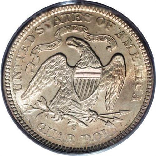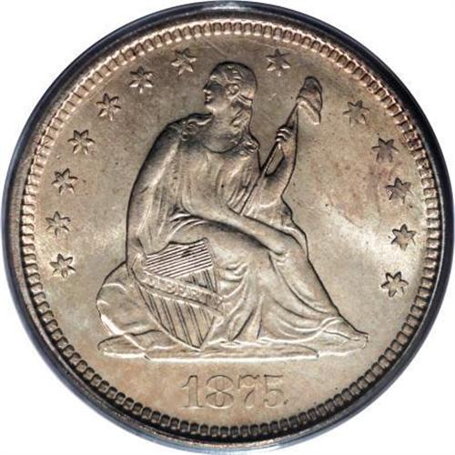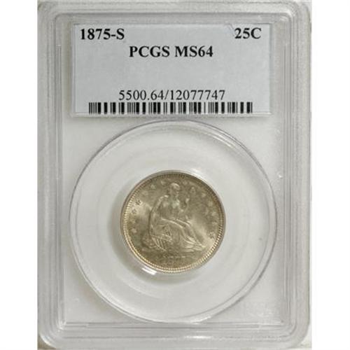 <B>1875-S 25C MS64 PCGS.</B></I> Type Two Reverse. Die 2-C. Unlike its half dollar counterpart, the 1875-S quarter is a scarce issue. Briggs (1991) states, "For the mintage a very elusive coin in all grades, suggesting the mintage is incorrect." This is a remarkably lustrous coin and each side shows just the slightest overlay of golden toning. <BR><BR><B>Coin Engraver:</B> Christian Gobrecht<BR><BR><b>Shipping:</b> Coins & Currency (<a target="_blank" href="http://www.heritageauctions.com/common/shipping.php">view shipping information</a>)