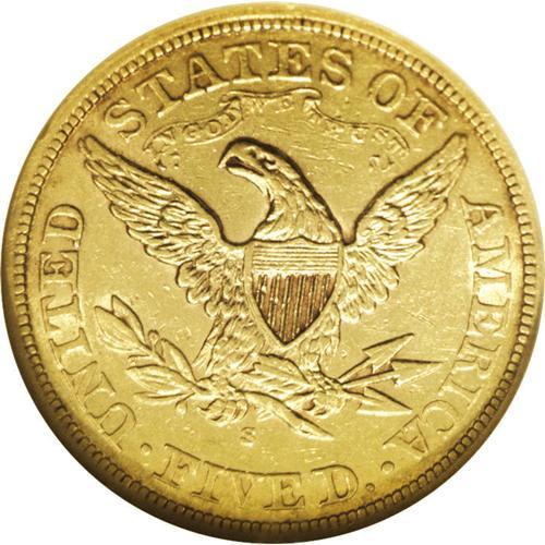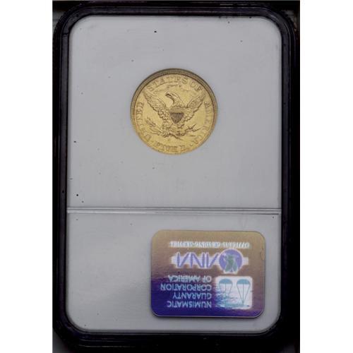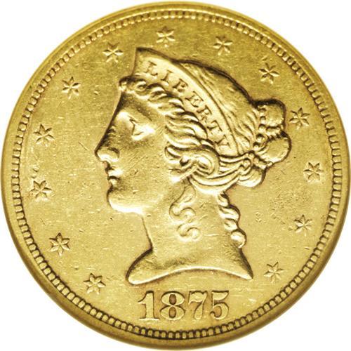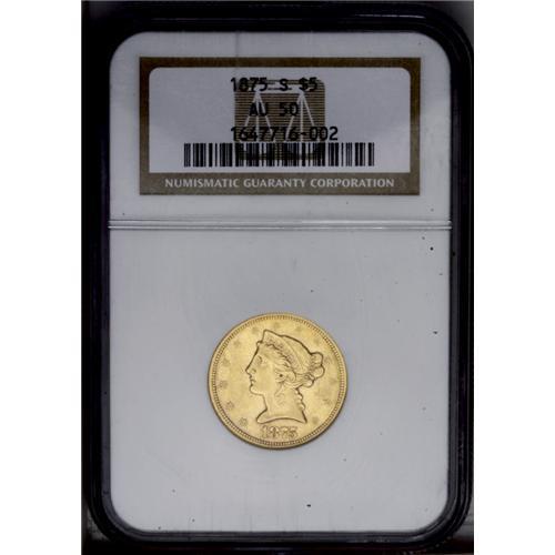 <B>1875-S<$5> AU50 NGC.</B></I> Seldom seen in any grade higher than VF or XF, due not only to its small mintage of 9,000 pieces, but also because so many San Francisco-issue coins of this era saw heavy duty in circulation. This piece shows about half of its original mint luster over light honey-gold surfaces which have light abrasions on both sides, none too distracting. The diagnostic die lapping has removed much of the scroll that bears the motto. Census: 7 in 50, 20 finer (3/06).<BR><I>From The Steve Glenn Collection.</B></I> <BR><BR><B>Important notice:</B> Heritage usually auctions material at the rate of 200-250 lots per hour. On some occasions eBay Live bid software or the Internet may not be able to keep up with the pace of the auction. We recommend placing a realistic absentee bid now as insurance to avoid disappointment. Occasionally the auctioneer may eliminate or reject an eBay Live bid, and the auctioneer may also reopen a lot after the close of the eBay live bidding (usually because we missed an audience bid), and may reject your bid even if it shows you as the winning bidder. By bidding via eBay Live, you agree that Heritage may award the lot to another bidder at its sole discretion under the circumstances described above or any other reasonable circumstances. Since eBay bids are not shown to us until we open the lot on the floor, we treat those bids just like floor bids. In most cases the floor responds before the eBay bid is presented to us, due to Internet lag time, so for consistency we have made it a policy that floor bids are always considered first over tie eBay live bids. Also please note that all Heritage lots purchased through eBay Live carry a 20% Buyer's Premium. Please make sure you read the Terms and Conditions before you bid. This lot is being auctioned in conjunction with a live floor auction by Heritage Galleries & Auctioneers. All final auction and invoice information will be supplied by Heritage Galleries & Auctioneers, and all other information should be considered preliminary. Lot:2790 <BR><BR><B>Winning Notification and Billing:</B> After the FINAL session in this auction is complete, Heritage will send e-mail and snail mail invoices. This process normally takes several days. All final auction and invoice information will be supplied by Heritage Galleries & Auctioneers, and all other information should be considered preliminary. <BR><BR>This auction will be conducted on a live auction floor and over the Internet through eBay Live. If you choose to place an absentee bid, please take a moment to <font color='#0000ff'><u><a href='http://pages.ebay.com/liveauctions/help/before/laabsentee.html'>learn how eBay Live absentee bidding works</a></u></font><font color='#000000'>