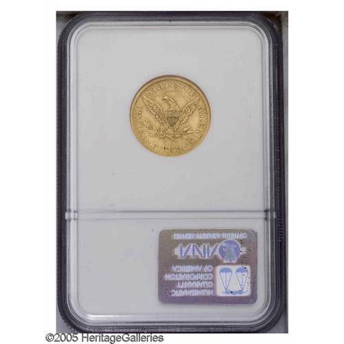<B>1875-S<$5> VF35 NGC.</B></I> Subdued yellow coloration with faint hairlines on both sides. A considerable portion of the scroll on the reverse is incomplete, leaving many letters of IN GOD WE TRUST isolated in the field.