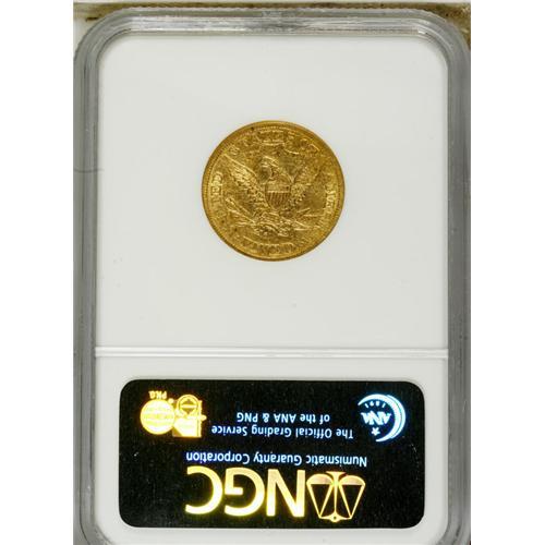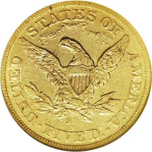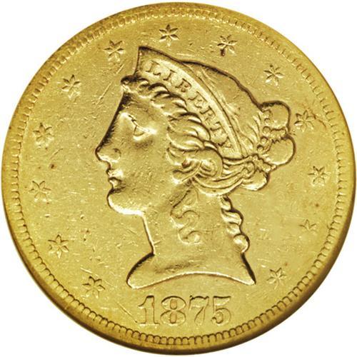 <B>1875-S $5 XF45 NGC.</B></I> The 1875-S is a scarce issue in all grades, as it was heavily used in commerce. In fact, Mint State pieces are almost unheard of; NGC has certified only one - an MS60, while PCGS has seen no Uncirculated 1875-S's. This Choice XF coin displays bright yellow-gold, lightly abraded surfaces, with traces of luster clinging to the design elements. Nice definition is apparent on the motifs. Census: 7 in 45, 29 finer (1/07).<BR><BR><b>Shipping:</b> Coins & Currency (<a target="_blank" href="http://www.heritageauctions.com/common/shipping.php">view shipping information</a>)