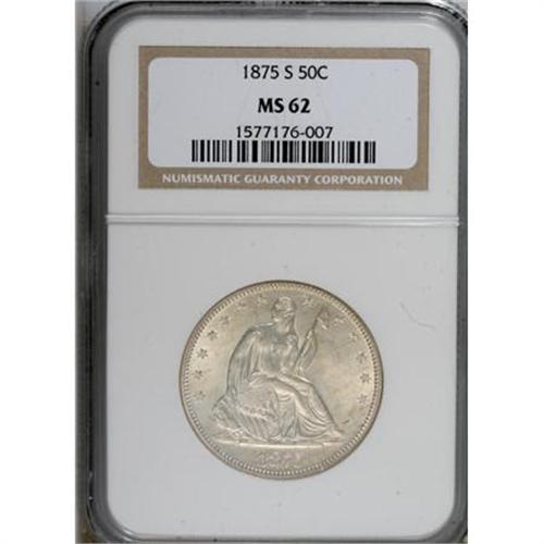 <B>1875-S 50C MS62 NGC.</B></I> NGC Census: (31/131). PCGS Population (30/176). Mintage: 3,200,000. Numismedia Wsl. Price for NGC/PCGS coin in MS62: $525. (#6351)<BR><BR><B>Coin Engraver:</B> Christian Gobrecht<BR><BR><b>Shipping:</b> Coins & Currency (<a target="_blank" href="http://www.heritageauctions.com/common/shipping.php">view shipping information</a>)