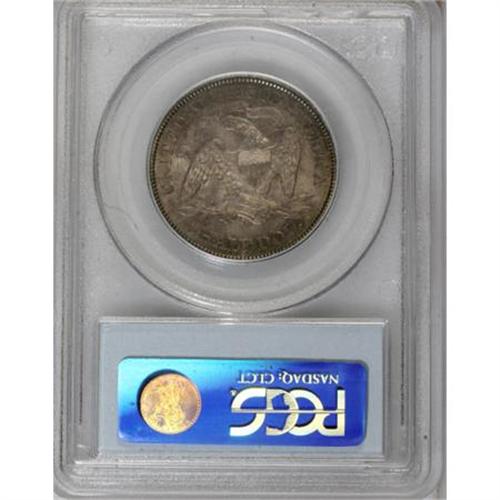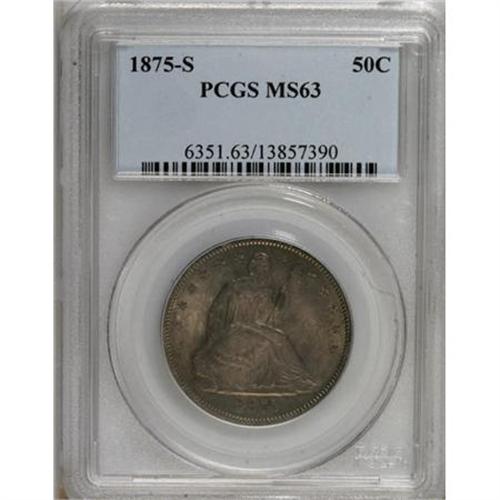 <B>1875-S 50C MS63 PCGS.</B></I> Surprisingly well-detailed for this San Francisco issue with smooth luster below olive-green and plum patina. A number of wispy, isolated marks on each side account for the grade.<BR><BR><B>Coin Engraver:</B> Christian Gobrecht<BR><BR><b>Shipping:</b> Coins & Currency (<a target="_blank" href="http://www.heritageauctions.com/common/shipping.php">view shipping information</a>)