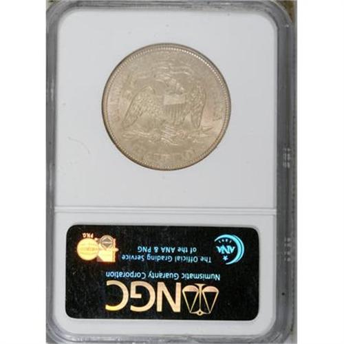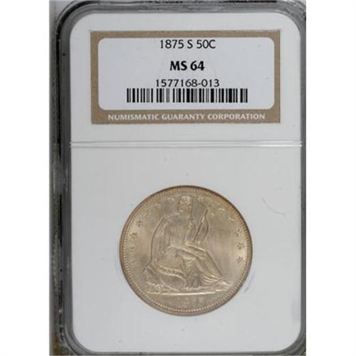 <B>1875-S 50C MS64 NGC.</B></I> An ivory near-Gem with excellent design definition. Satiny silver luster is only slightly subdued by light gold and pale rose toning. Census: 52 in 64, 42 finer (8/07).<BR><BR><B>Coin Engraver:</B> Christian Gobrecht<BR><BR><b>Shipping:</b> Coins & Currency (<a target="_blank" href="http://www.heritageauctions.com/common/shipping.php">view shipping information</a>)