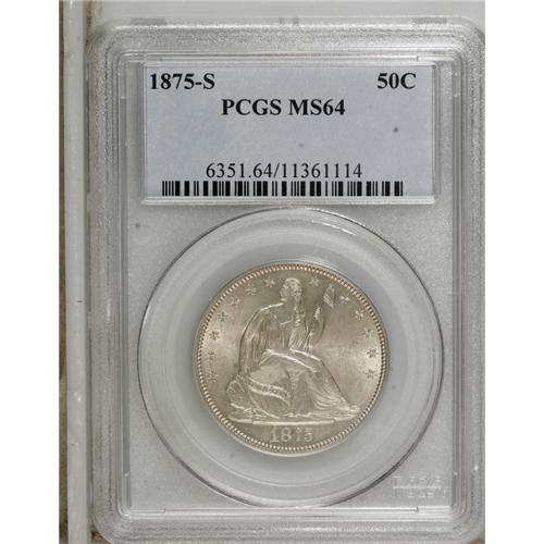 <B>1875-S 50C MS64 PCGS.</B></I> A thin veneer of light gold color visits lustrous surfaces, and the design elements are well brought up on this pleasing near-Gem. A small mark shows on Liberty's right (left facing) arm. Fine peripheral cracks are noted on each side. Population: 64 in 64, 57 finer (2/07).<BR><BR><b>Shipping:</b> Coins & Currency (<a target="_blank" href="http://www.heritageauctions.com/common/shipping.php">view shipping information</a>)