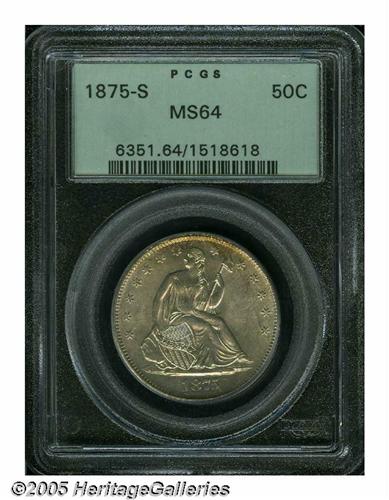 <B>1875-S<50C> MS64 PCGS.</B></I> Sharply struck with attractive silver-gray toning over both sides, and a small degree of russet coloration near some of the peripheries. Highly lustrous and carefully preserved, the coin has a few superficial grazes and small marks that prevent a higher numerical grade assignment. Confined to a green label PCGS holder. Population: 63 in 64, 52 finer (5/05).