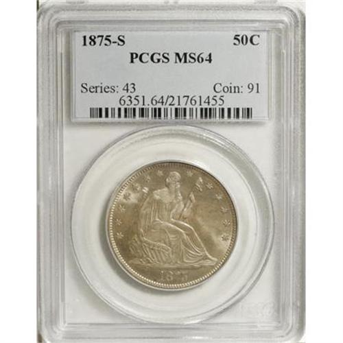 <B>1875-S 50C MS64 PCGS.</B></I> The arrows flanking the date for the previous two years were removed for the 1875 issues, marking the last design change within the Seated series. This frosty near-Gem offers lovely lavender and gold toning over silver-white surfaces and pleasing central sharpness, though a few stars show softness.<BR><BR><B>Coin Engraver:</B> Christian Gobrecht<BR><BR><b>Shipping:</b> Coins & Currency (<a target="_blank" href="http://www.heritageauctions.com/common/shipping.php">view shipping information</a>)