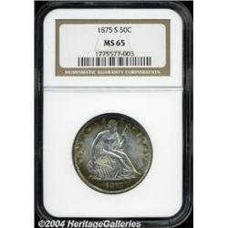 <B>1875-S<50C> MS65 NGC.</B></I> Richly toned in golden-russet hues about the peripheries, both the obverse and the reverse reveal intense cartwheel luster. The features exhibit razor sharp delineation that extends significantly to Liberty's head and the surrounding stars. Scarcely known finer, this expertly preserved example belongs in the finest Gem quality type collection. <BR><BR><B>Important notice:</B> Heritage usually auctions material at the rate of 200-250 lots per hour. On some occasions eBay Live bid software or the Internet may not be able to keep up with the pace of the auction. We recommend placing a realistic absentee bid now as insurance to avoid disappointment. Occasionally the auctioneer may eliminate or reject an eBay Live bid, and the auctioneer may also reopen a lot after the close of the eBay live bidding (usually because we missed an audience bid), and may reject your bid even if it shows you as the winning bidder. By bidding via eBay Live, you agree that Heritage may award the lot to another bidder at its sole discretion under the circumstances described above or any other reasonable circumstances. Since eBay bids are not shown to us until we open the lot on the floor, we treat those bids just like floor bids. In most cases the floor responds before the eBay bid is presented to us, due to Internet lag time, so for consistency we have made it a policy that floor bids are always considered first over tie eBay live bids. Also please note that all Heritage lots purchased through eBay Live carry a 20% Buyer's Premium. Please make sure you read the Terms and Conditions before you bid. </span></font></tr></table></td></tr></table>