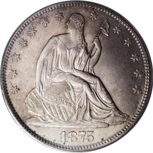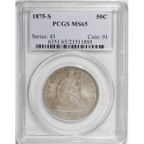 <B>1875-S 50C MS65 PCGS.</B></I> A delicate mix of golden-tan and soft violet patination rests on lustrous surfaces that are devoid of significant contact marks. Sharp definition is apparent on the design elements, save for minor softness in a couple of the star centers and in the right (left facing) claw. Four or five minute toning flecks are noted on the obverse. With a mintage of 3.2 million pieces, the 1875-S is an excellent type coin. This example will fit comfortably in a high-grade Mint State collection. Population: 47 in 65, 11 finer (8/07).<BR><BR><B>Coin Engraver:</B> Christian Gobrecht<BR><BR><b>Shipping:</b> Coins & Currency (<a target="_blank" href="http://www.heritageauctions.com/common/shipping.php">view shipping information</a>)