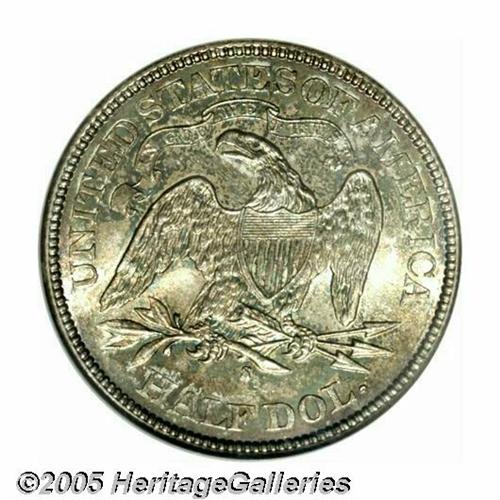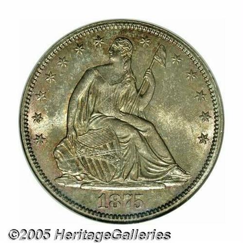 <B>1875-S<50C> MS66 NGC.</B></I> The 1875-S is arguably the most frequently encountered issue in the With Motto series of Seated halves. Few, however, are well preserved as this lovely coin. The devices show pinpoint striking definition and there are no noticeable or mentionable marks on either side. Superb mint luster underlies the speckled sea-green and rose toning and gives the coin exceptional eye appeal. Population: 6 in 66, 0 finer (4/05).