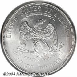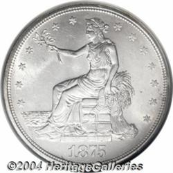 <table><tr><td><table><tr><td>1875-S/CC T$1 MS62 NGC. FS-012.6. Type One Obverse and Reverse. Large S mintmark. In recent years, specialists have learned there are two 1875-S/CC varieties. FS-012.6 differs from FS-012.5 in that the S mintmark is further to the right, and the second C in the mintmark is closer to the primary mintmark. This second C is faint, but its curve and serif are unmistakable. A mintmark remnant is also found left of the S mintmark. A lustrous and virtually brilliant example with clean fields and a couple of unimportant contact marks on the reverse rim near 3 o'clock. Nicely struck, with moderate softness of detail on the eagle's right (facing) leg. FS-012.6 NGC Population: 2 in 62, 1 finer (1/04). <BR><BR><B>Important notice:</B> Heritage usually auctions material at the rate of 200-250 lots per hour. On some occasions eBay Live bid software or the Internet may not be able to keep up with the pace of the auction. We recommend placing a realistic absentee bid now as insurance to avoid disappointment. Occasionally the auctioneer may eliminate or reject an eBay Live bid, and the auctioneer may also reopen a lot after the close of the eBay live bidding (usually because we missed an audience bid), and may reject your bid even if it shows you as the winning bidder. By bidding via eBay Live, you agree that Heritage may award the lot to another bidder at its sole discretion under the circumstances described above or any other reasonable circumstances. Since eBay bids are not shown to us until we open the lot on the floor, we treat those bids just like floor bids. In most cases the floor responds before the eBay bid is presented to us, due to Internet lag time, so for consistency we have made it a policy that floor bids are always considered first over tie eBay live bids. Also please note that all Heritage lots purchased through eBay Live carry a 20% Buyer's Premium. Please make sure you read the Terms and Conditions before you bid. <BR><BR><B>IMPORTANT ANNOUNCEMENT ABOUT RESERVES:</B> Heritage now divulges all reserves on its web site 7 days before every auction. If you want to know whether the reserve on this lot has been met, and if not, what the reserve amount is, please visit this lot page on the HeritageCoin.com web site, or email: bid@HeritageGalleries.com </span></font></td></tr></table></td></tr></table>