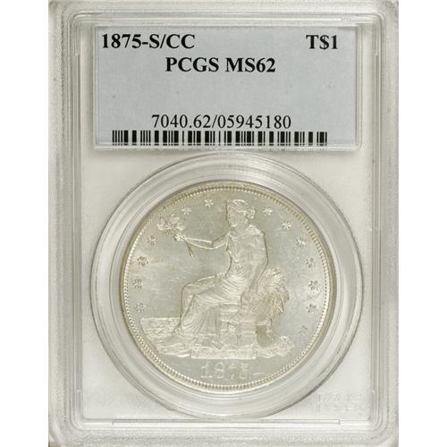 <B>1875-S/CC T$1 MS62 PCGS.</B></I> FS-012.5. Type One Reverse, Large S. This popular overmintmark has remained rare in Uncirculated grades since it was first discovered. On this piece, the first C is not visible but the second C is fully delineated. The surfaces are brilliant throughout and the fields are bright with a confirmed semi-prooflikeness. Sharply defined, except on the head of Liberty, as often seen. Population: 7 in 62, 13 finer (3/07).<BR><BR><b>Shipping:</b> Coins & Currency (<a target="_blank" href="http://www.heritageauctions.com/common/shipping.php">view shipping information</a>)