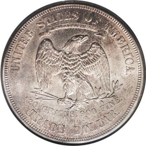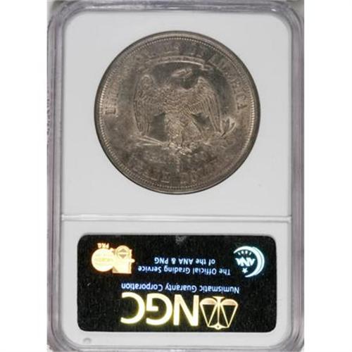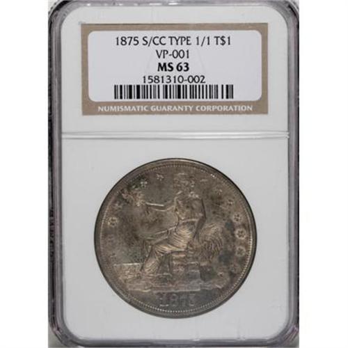 <B>1875-S/CC T$1 MS63 NGC.</B></I> VP-001. FS-501, formerly FS-012.5. Type One Reverse. The more obvious of the two 1875-S/CC varieties, the presence of the C mintmark to the right of the S is irrefutable. David Bowers (1993) writes: "This issue was generally unknown to numismatists until the early 1960s. One of the earliest market appearances of the variety was in New Netherlands Coin Company's sale of December 10-11, 1963." Bowers go on to say: "In 1962-3, the 1875-S/CC overmintmark was considered to be a great rarity, but over a period of time additional specimens came to light. Today it is considered to be moderately scarce in lower grades and quite rare in Mint State."<BR> The lustrous surfaces of this select specimen display electric-blue, lavender, and gray-tan toning, and just a few minor ticks that limit the grade. An impressive strike brings out sharp definition on the design features. Census: 3 in 63, 4 finer (8/07).<BR><BR><B>Coin Engraver:</B> William Barber<BR><BR><b>Shipping:</b> Coins & Currency (<a target="_blank" href="http://www.heritageauctions.com/common/shipping.php">view shipping information</a>)