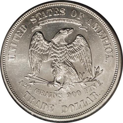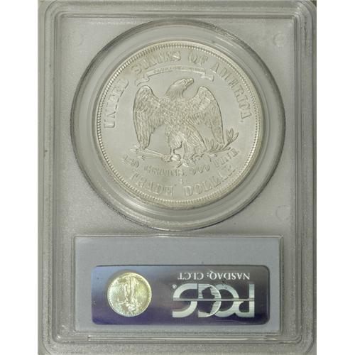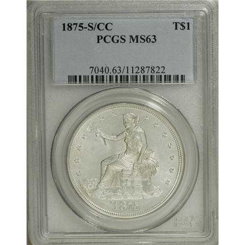 <B>1875-S/CC T$1 MS63 PCGS.</B></I> FS-501, formerly FS-012.5. Type One Reverse. All known examples of the S/CC overmintmark variety are from the Type One reverse hub. The underlying CC mintmark is still quite prominent on this example, while on certain later die states it becomes nearly impossible to see. There are actually two different reverse dies known with a similar S/CC blunder, and this example is the more desirable variety with the Large S mintmark left of center over remnants of the former CC mintmark. This piece is a splendid Mint State example with satiny, slightly reflective fields and full brilliance on both sides. Population: 7 in 63, 5 finer (1/07).<BR><BR><b>Shipping:</b> Coins & Currency (<a target="_blank" href="http://www.heritageauctions.com/common/shipping.php">view shipping information</a>)