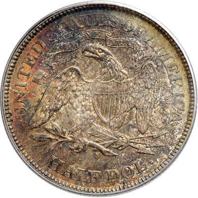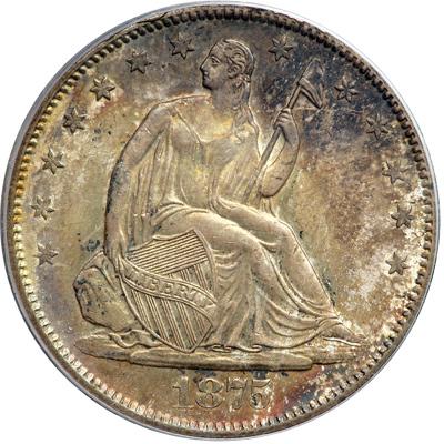 1875-S Liberty Seated Half Dollar. PCGS graded MS-63 PQ. CAC Approved. Average strike but with with wonderful multi-color toning on both sides atop the frosted luster. A Premium Quality coin for the grade (PCGS # 6351) .