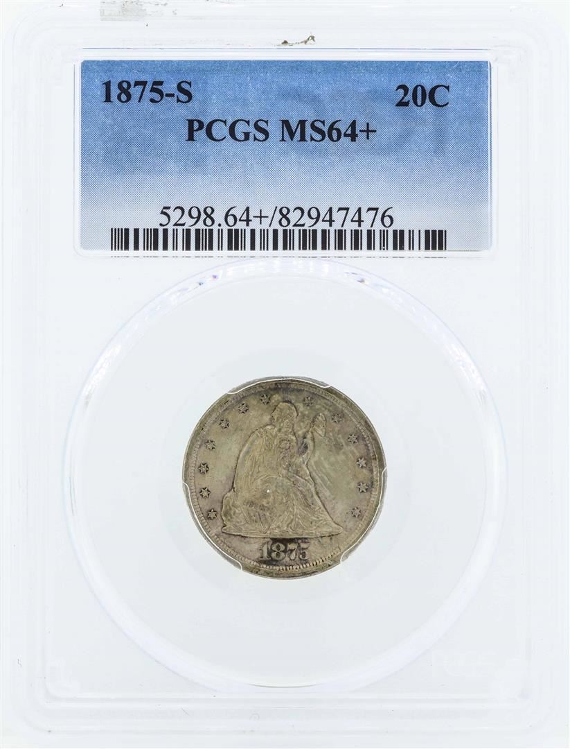 One 1875-S Seated Liberty Twenty Cent Piece Coin PCGS MS64+. PCGS Certified.