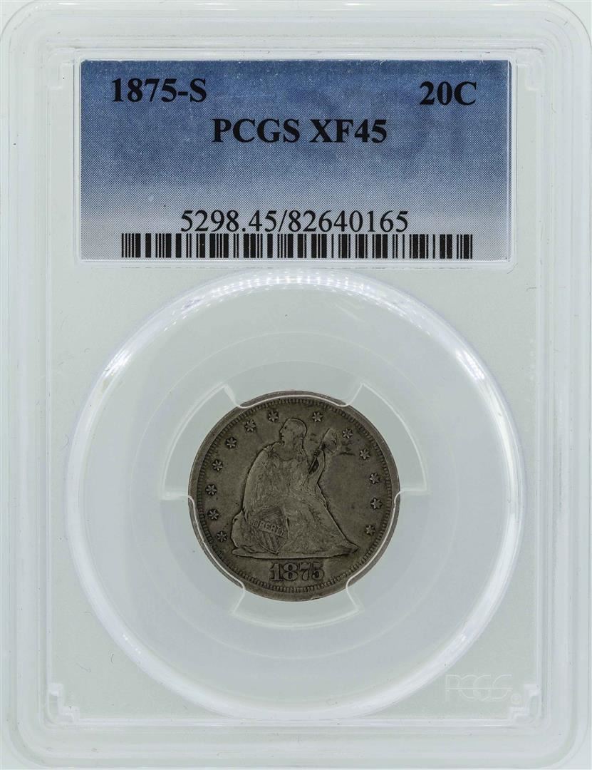 One 1875-S Seated Liberty Twenty Cent Piece Coin PCGS XF45. PCGS Graded.