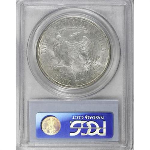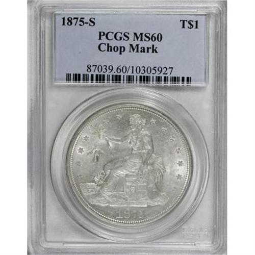 <B>1875-S T$1 Chop Mark MS60 PCGS.</B></I> Type Two Reverse. Large S. A softly lustrous silver-gray piece that shows two chop marks in the left obverse field, one slightly overlapping Liberty's shins. While the surfaces show a number of wispy abrasions, they also display no trace of wear.<BR><BR><b>Shipping:</b> Coins & Currency (<a target="_blank" href="http://www.heritageauctions.com/common/shipping.php">view shipping information</a>)