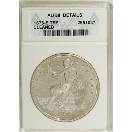 <B>1875-S T$1 --Cleaned--ANACS. AU58 Details.</B></I> NGC Census: (70/547). PCGS Population (94/693). Mintage: 4,487,000. Numismedia Wsl. Price: $325. (#7039)<BR><BR><b>Shipping:</b> Coins & Currency (<a target="_blank" href="http://www.heritageauctions.com/common/shipping.php">view shipping information</a>)