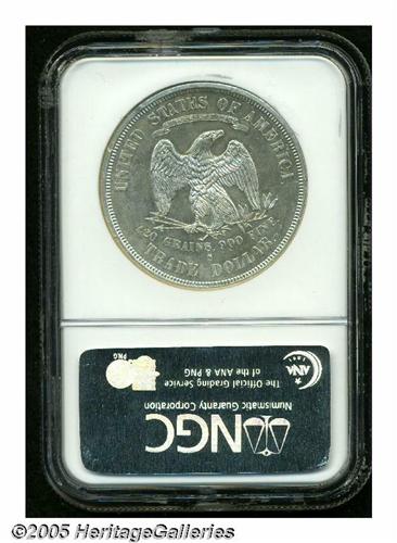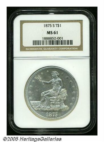 <B>1875-S<T$1> MS61 NGC.</B></I> Type One Reverse, Large S. An untoned and nicely struck Trade Dollar, refreshingly unmarked except for a couple of tiny rim dings.