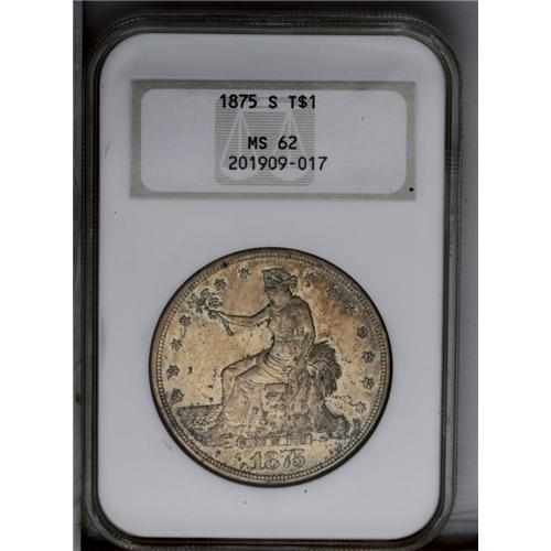 1875-S T$1 MS62 NGC. Type Two Reverse, Large S. Deep p