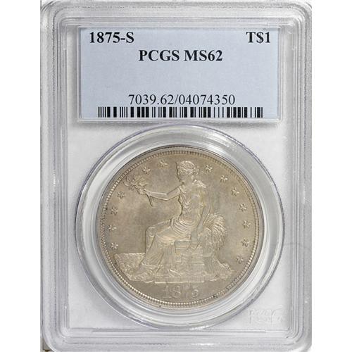 <B>1875-S T$1 MS62 PCGS.</B></I> Type One Reverse. Large S. A strongly lustrous example that has zones of silver-gray and pale orange. Suitably struck with remarkable eye appeal that evokes a higher grade.<BR><BR><b>Shipping:</b> Coin/Currency (<a target="_blank" href="http://www.heritageauctions.com/common/shipping.php">view shipping information</a>)