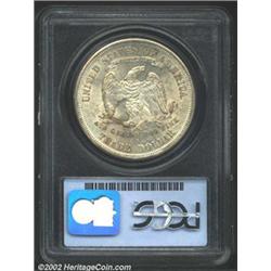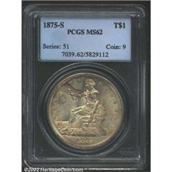1875-S T$1 MS62 PCGS. Type I Obverse / Type II Reverse. Large S. Breen 5793. The obverse is overlaid in sparkling golden iridescence, and there are whispers of champagne coloration toward the upper right border. Virtually untoned, the reverse is equally as frosty as the obverse, and both sides are also sharply struck in all areas. There are no abrasions that are out of context with the MS62 grade level.From the Andy Geosits Collection of Trade Dollars. Important notice: We expect to be auctioning lots at the rate of 200-250 per hour. Sometimes eBay Premier live bid software cannot keep up with that pace, so we strongly recommend that you place a realistic proxy bid now as insurance to avoid disappointment. Also please note that all Heritage/CAA lots purchased through eBay Premier carry a 20% Buyer's Premium. Please make sure you read the Terms and Conditions.