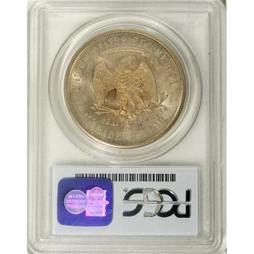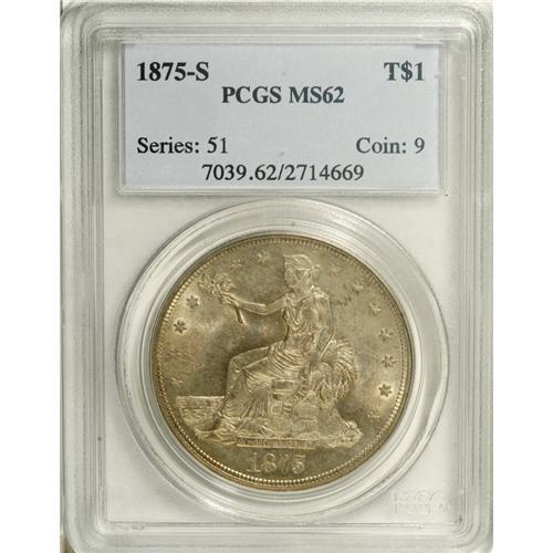 <B>1875-S T$1 MS62 PCGS.</B></I> Type One Reverse. Large S mintmark. A berry under the left (right facing) claw confirms the Type One Reverse. A coating of light tan-gold color bathes lustrous surfaces. Generally well struck, save for the usual softness in Liberty's hair. A few minute handling marks are seen on each side.<BR><BR><b>Shipping:</b> Coins & Currency (<a target="_blank" href="http://www.heritageauctions.com/common/shipping.php">view shipping information</a>)