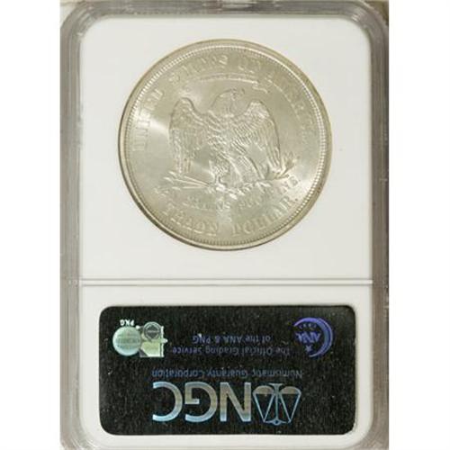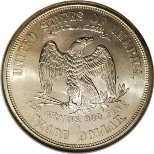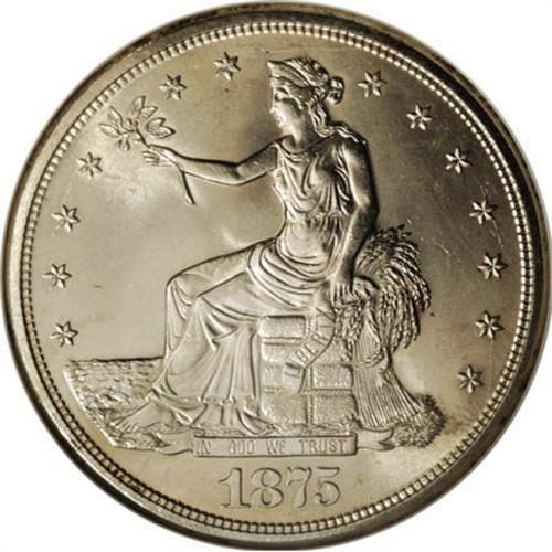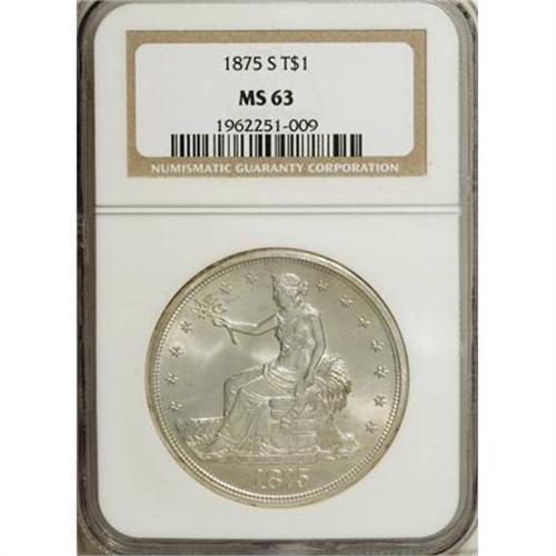 <B>1875-S T$1 MS63 NGC.</B></I> Type One Obverse and Reverse. Large S. This pleasing Trade dollar has booming luster and a hint of yellow-gold toning. Liberty's hair and right (facing) claw lack absolute detail, but the strike is generally sharp. Much smoother than expected for the MS63 grade, and certain to see spirited bidding on the auction floor.<BR><BR><B>Coin Engraver:</B> William Barber<BR><BR><b>Shipping:</b> Coins & Currency (<a target="_blank" href="http://www.heritageauctions.com/common/shipping.php">view shipping information</a>\)