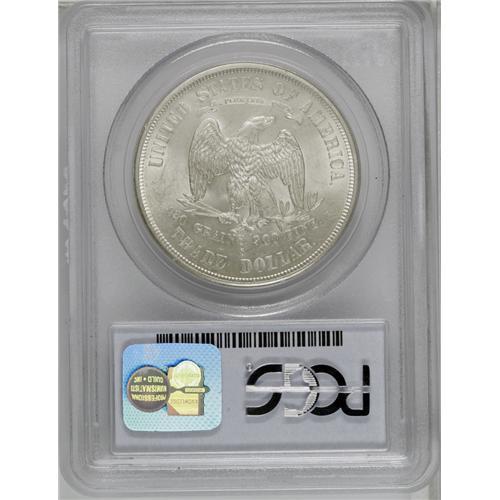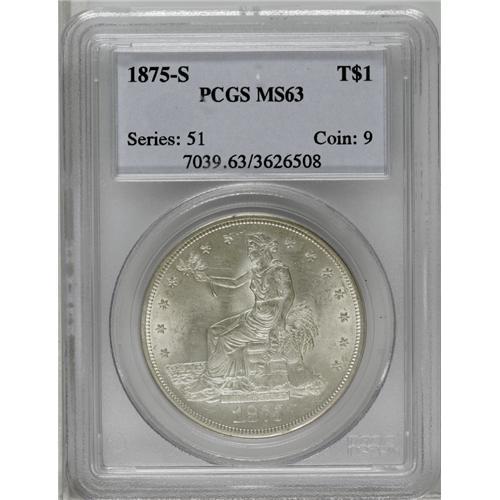 <B>1875-S<T$1> MS63 PCGS.</B></I> Type One Obverse and Reverse. Mostly brilliant with shimmering, satiny fields that are only modestly affected by scattered surface marks. Although produced in substantial numbers (nearly 4.5 million pieces), Select and better survivors are not around in abundance. <BR><BR><B>Important notice:</B> Heritage usually auctions material at the rate of 200-250 lots per hour. On some occasions eBay Live bid software or the Internet may not be able to keep up with the pace of the auction. We recommend placing a realistic absentee bid now as insurance to avoid disappointment. Occasionally the auctioneer may eliminate or reject an eBay Live bid, and the auctioneer may also reopen a lot after the close of the eBay live bidding (usually because we missed an audience bid), and may reject your bid even if it shows you as the winning bidder. By bidding via eBay Live, you agree that Heritage may award the lot to another bidder at its sole discretion under the circumstances described above or any other reasonable circumstances. Since eBay bids are not shown to us until we open the lot on the floor, we treat those bids just like floor bids. In most cases the floor responds before the eBay bid is presented to us, due to Internet lag time, so for consistency we have made it a policy that floor bids are always considered first over tie eBay live bids. Also please note that all Heritage lots purchased through eBay Live carry a 20% Buyer's Premium. Please make sure you read the Terms and Conditions before you bid. This lot is being auctioned in conjunction with a live floor auction by Heritage Galleries & Auctioneers. All final auction and invoice information will be supplied by Heritage Galleries & Auctioneers, and all other information should be considered preliminary. Lot:2222 <BR><BR><B>Winning Notification and Billing:</B> After the FINAL session in this auction is complete, Heritage will send e-mail and snail mail invoices. This process normally takes several days. All final auction and invoice information will be supplied by Heritage Galleries & Auctioneers, and all other information should be considered preliminary. <BR><BR>This auction will be conducted on a live auction floor and over the Internet through eBay Live. If you choose to place an absentee bid, please take a moment to <font color='#0000ff'><u><a href='http://pages.ebay.com/liveauctions/help/before/laabsentee.html'>learn how eBay Live absentee bidding works</a></u></font><font color='#000000'>