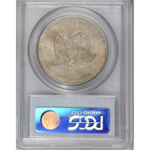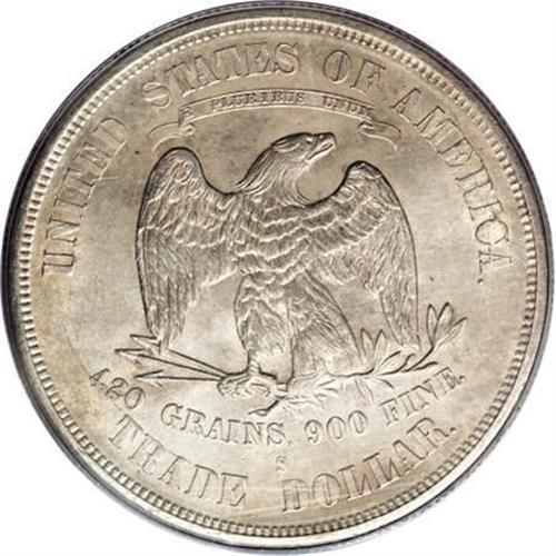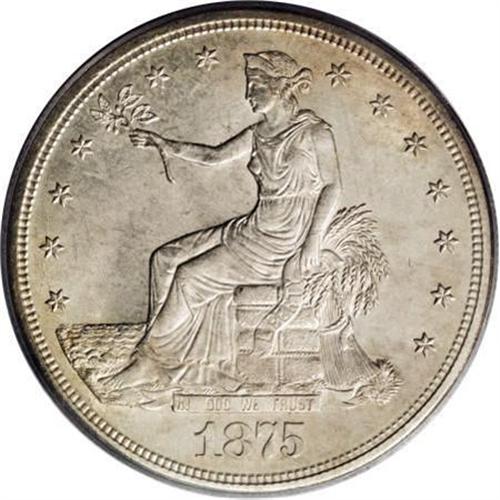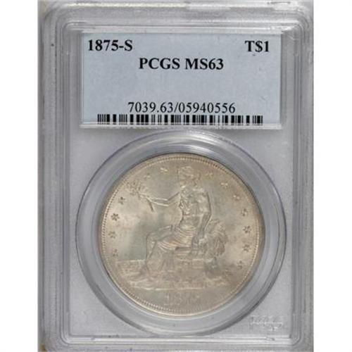 <B>1875-S T$1 MS63 PCGS.</B></I> Type One Reverse. Large S. Dusky golden-gray toning drapes this lustrous and unblemished representative. The strike is precise save the usual slight blending of detail on Liberty's hair and the eagle's right (facing) leg. The eye appeal is excellent for the grade.<BR><BR><B>Coin Engraver:</B> William Barber<BR><BR><b>Shipping:</b> Coins & Currency (<a target="_blank" href="http://www.heritageauctions.com/common/shipping.php">view shipping information</a>)
