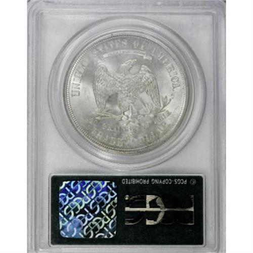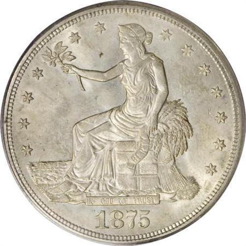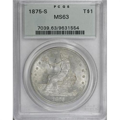 <B>1875-S T$1 MS63 PCGS.</B></I> A veneer of light gold patina rests on highly lustrous surfaces that display some field-motif contrast, especially on the reverse. Sharp definition is apparent on the design elements, save for softness in Liberty's hair, the upper stars, and the eagle's left (right facing) claw. A few minor marks account for the grade of this green-labeled coin.<BR><BR><B>Coin Engraver:</B> William Barber<BR><BR><b>Shipping:</b> Coins & Currency (<a target="_blank" href="http://www.heritageauctions.com/common/shipping.php">view shipping information</a>)