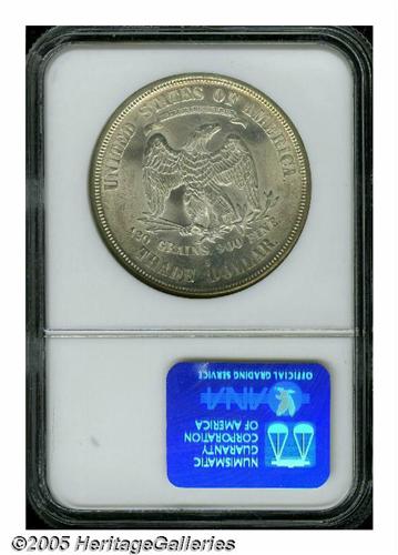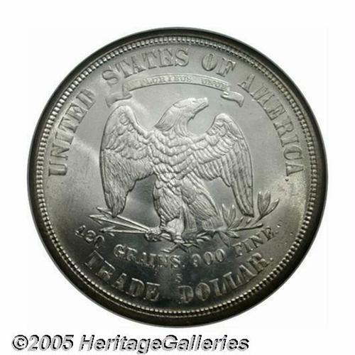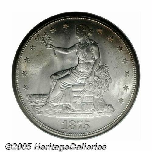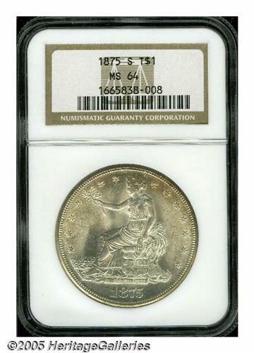 <B>1875-S<T$1> MS64 NGC.</B></I> Type One Reverse. Frosty luster. Fully brilliant in the central areas with wisps of pale champagne iridescence at the borders. A typical strike for the issue with softness noted at Liberty's head and foot, and at the eagle's left claw. This is the variety with a berry on the olive branch beneath the eagle's left claw. Not easy to find this nicely preserved.