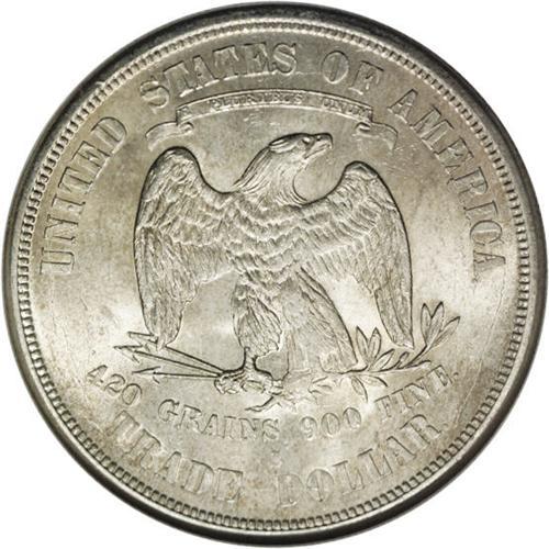 <B>1875-S<T$1> MS64 NGC.</B></I> Type One Reverse. Impressive, blazing cartwheel luster is the first thing that one notices about this lightly toned Trade dollar. A few small marks are found, and Liberty's hair and the eagle's right (facing) claw are typically brought up. Trade dollars were made for export, and as a type, are scarce in quality Mint State.