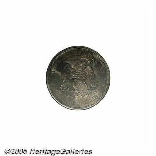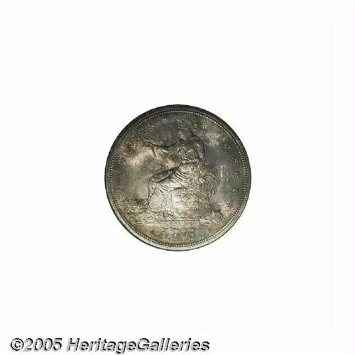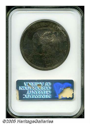<B>1875-S<T$1> MS64 NGC.</B></I> Type One Reverse, Large S. Dappled forest-green, rose-mauve, and tan-gray colors embrace this lustrous representative. The strike is sharp aside from the eagle's right (facing) claw, which often shows some softness even on proofs. Well preserved aside from a few scattered marks on the right side of the obverse. A scarce type coin in better Mint State grades. The holder has a small piece absent near the lower left front border.